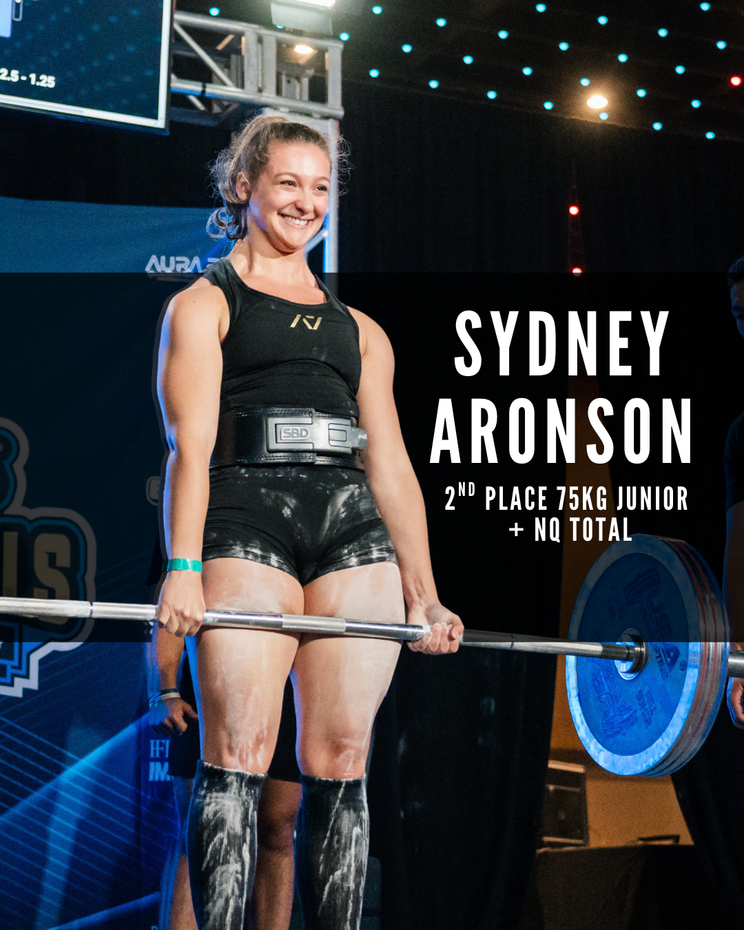 Sydney Aronson finished her second meet with a 15kg total PR. She finished 3/3 in squats with a 120kg squat, 1/3 in bench with an 82.5kg bench and 3/3 on deadlift with a 150kg deadlift.